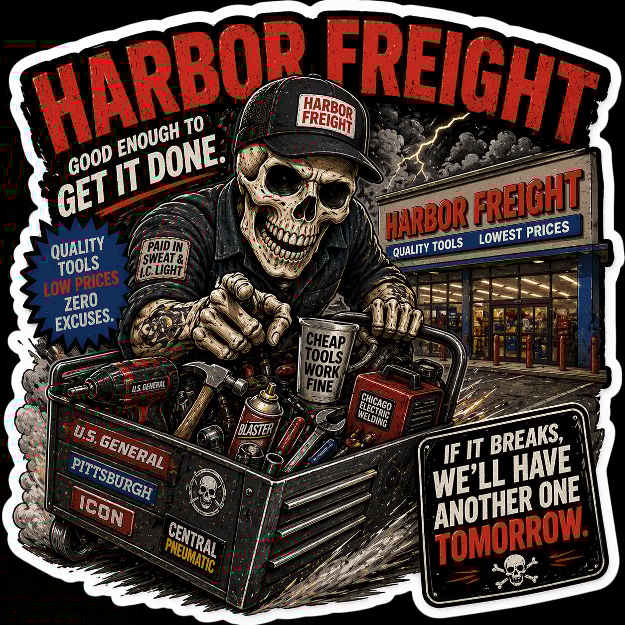 With a gritty skeleton mechanic front and center, surrounded by a loaded toolbox and that classic “cheap tools work fine” energy, this sticker hits hard for anyone who’s ever made it work with what they’ve got.