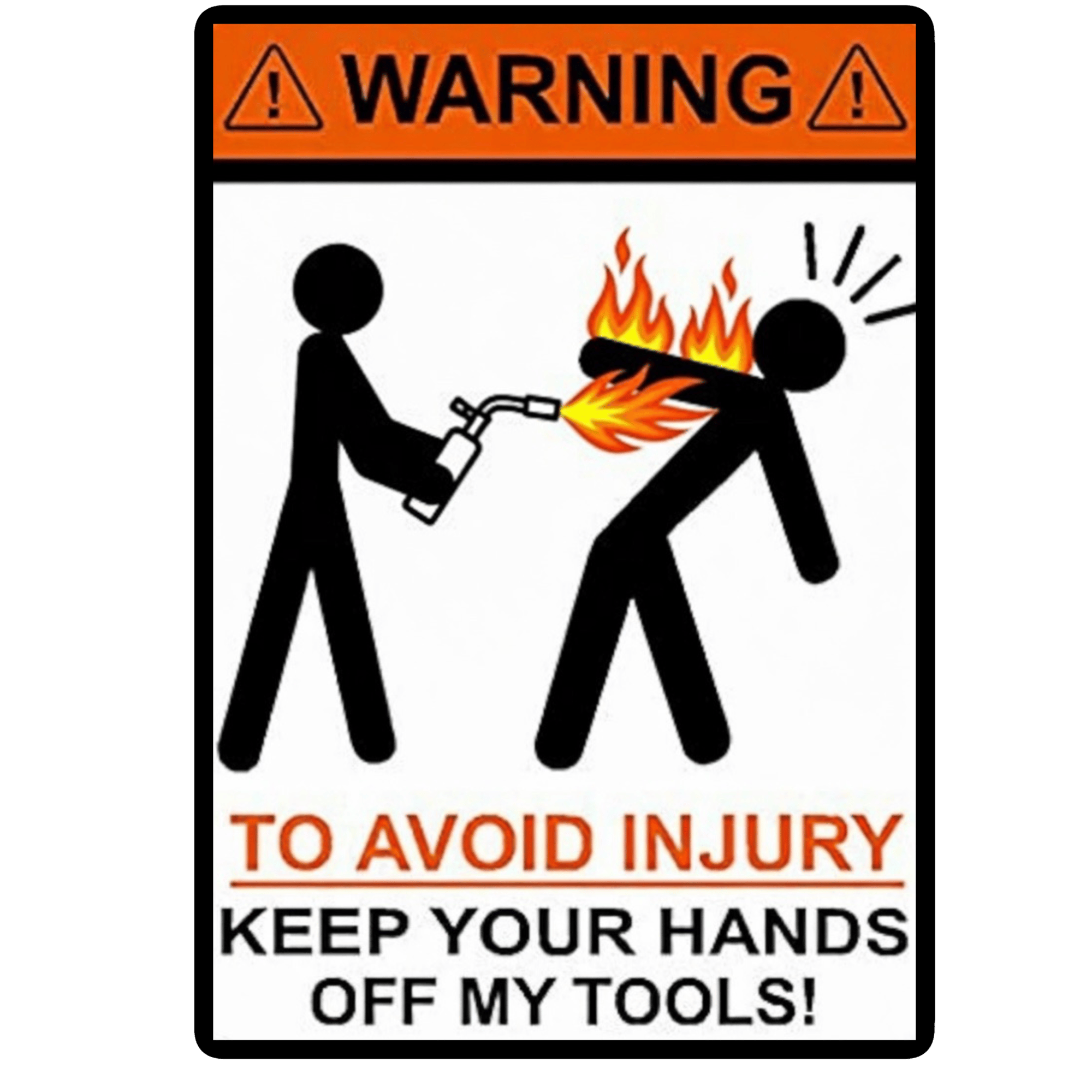 • Warning sticker: “TO AVOID INJURY KEEP YOUR HANDS OFF MY TOOLS!” (with the flaming stick-figure action)